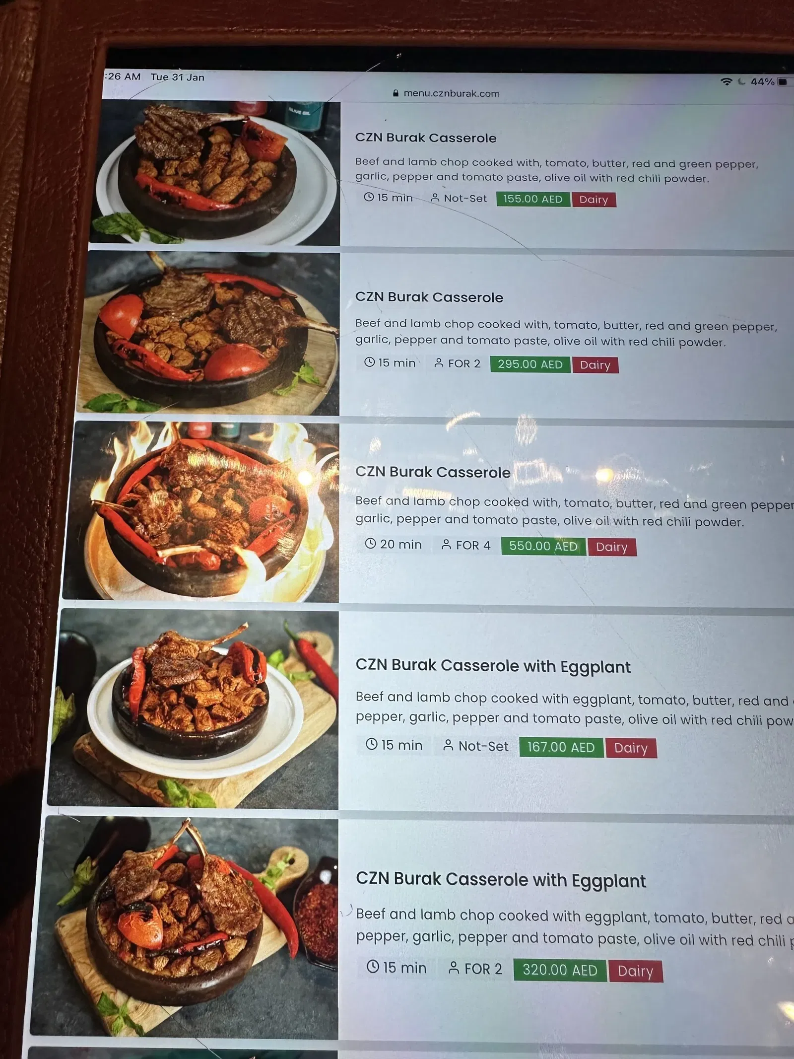 - فخارة لحم تكفي لثلاثة أشخاص بسعر ٥٢٠ درهم.